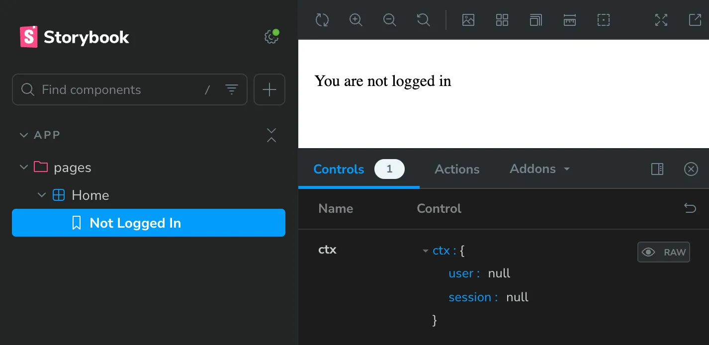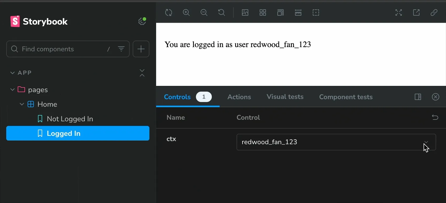 Let’s do it:src/app/pages/Home.stories.tsx 20 collapsed linesimport type { Meta, StoryObj } from "@storybook/react";import { Home } from "./Home";const meta: Meta<typeof Home> = {component: Home,};export default meta;type Story = StoryObj<typeof Home>;export const NotLoggedIn: Story = {args: {ctx: {user: null,session: null,},},};export const LoggedIn: Story = {args: {ctx: {user: {id: "1",username: "redwood_fan_123",createdAt: new Date(),},session: null,},},argTypes: {ctx: {options: ["redwood_fan_123", "storybook_user", "example_user"],mapping: {redwood_fan_123: {user: { id: "1", username: "redwood_fan_123", createdAt: new Date() },session: null,},storybook_user: {user: { id: "2", username: "storybook_user", createdAt: new Date() },session: null,},example_user: {user: { id: "3", username: "example_user", createdAt: new Date() },session: null,},},},},}; -