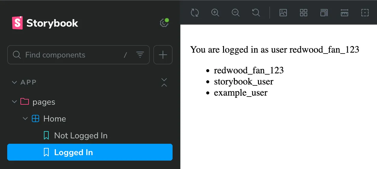 Save it, and go back to our Storybook site. We should see a new “Logged In” story: