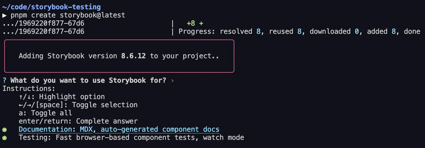 Select what we want to use Storybook for — I selected both Documentation and Testing, though this guide will only cover the documentation part: